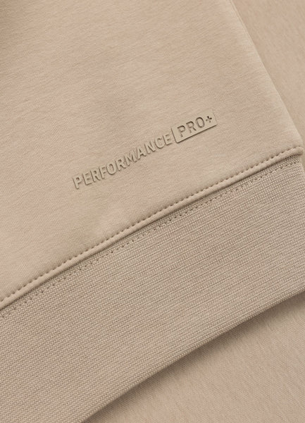 - small Performance Pro+ lettering at the bottom hem